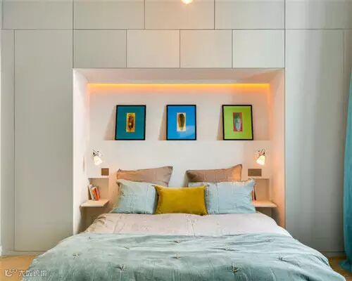 简约的淡色系让卧室在整体上看起来比较扩容,将收纳橱柜集中设计在床头背景墙上,让收纳在无形之中,安置在墙面的床头对称小柜包揽了床头柜的功能,更加简约奇趣。