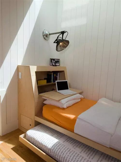 迷你的小卧室里也可以容纳下两个人,推拉床的设计即使是小房子也能招待好朋友了,床头柜设计容纳收纳和书桌功能。