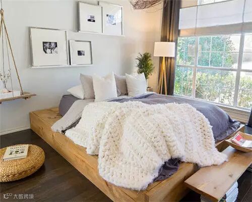 原木色的床铺给北欧风情增添了一些柔和温暖,床头隔板用作收纳,垂悬的吊板作为床头收纳让生活更具趣味。