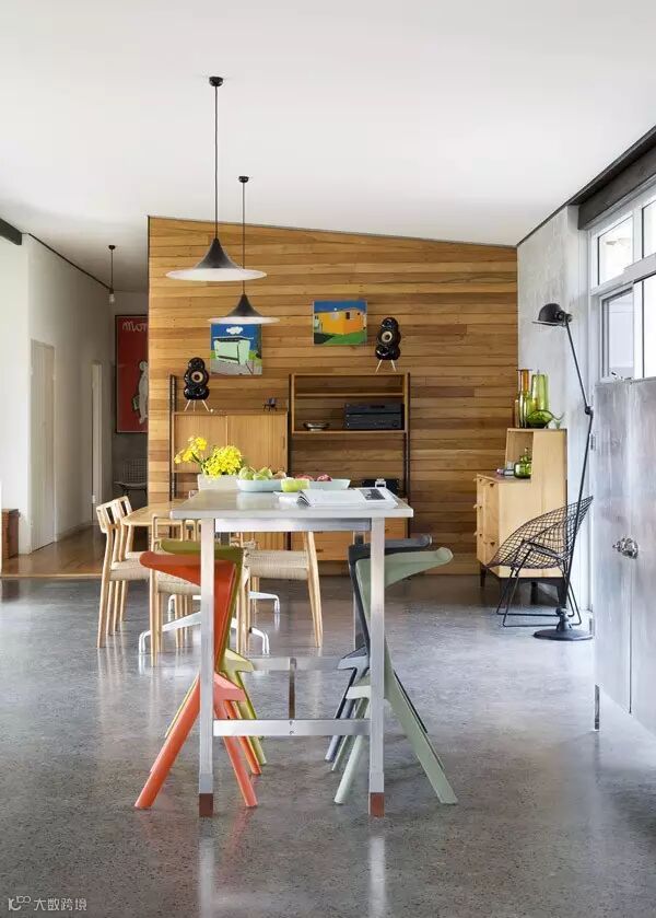▲ 餐厅和客厅一体化设计,高脚凳给客厅增加了色彩,总有一些有趣的玩意儿或者几幅活泼的画作,让人觉得意趣盎然。