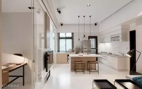 ▲考量一人世界的自由自在,设计师一改常见的复层应用,保留了完整的3米6屋高优势,搭配餐区吧台上方的装置主灯,流露着简约空间的美感内涵,同时也凸显出居宅视野的宽裕尺度。