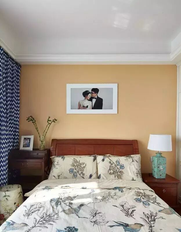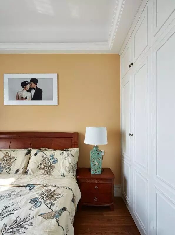 ▲卧室用了暖黄色的壁纸,比较温馨也和整体装修风格比较搭配,床的两侧一边装了床边书桌,一边装了一个床头柜。