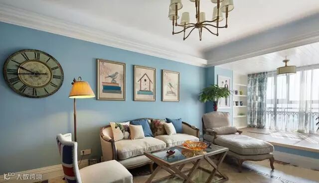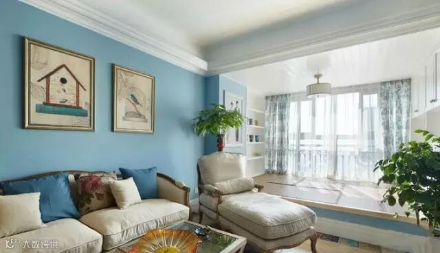 ▲客厅装了一个榻榻米,有时朋友来可以席地而坐聊聊天,周末也喜欢在这里晒晒太阳看看书,蓝色电视背景墙很简洁,没有多余累赘的装饰,又很契合整体蔚蓝色法式风情的感觉。
