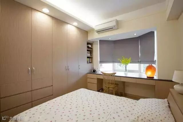 ▲主卧室空间利用极致,内嵌的梳妆台和收纳壁柜,隔断另一边是步入式的衣帽间