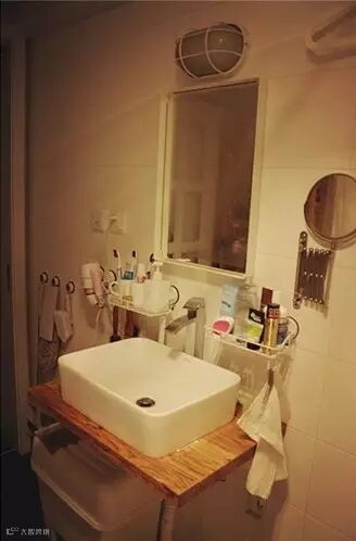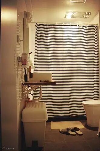 拉上浴帘的样子,卫生间比较小。自己用榆木板做了洗手台面。因为嫌外面买的都太丑