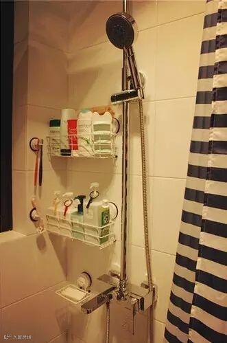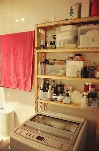 储物架上摆满了我的护肤品,放在塑料盒里可以防水