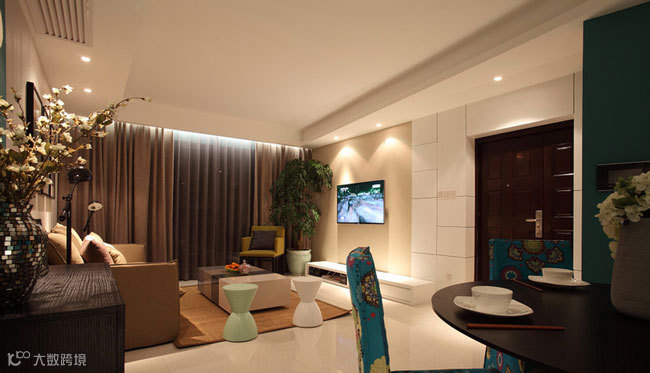 客厅与餐厅放置于一体,非常符合中国人用餐习惯。通过较深的咖色与怀旧黄色的搭配,再加上镭射灯光的映射,营造出温馨的氛围。