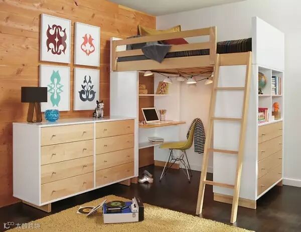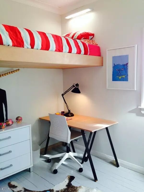 ▲ 床靠墙可以节省空间,利用衣橱与床之间的空隙摆放书桌