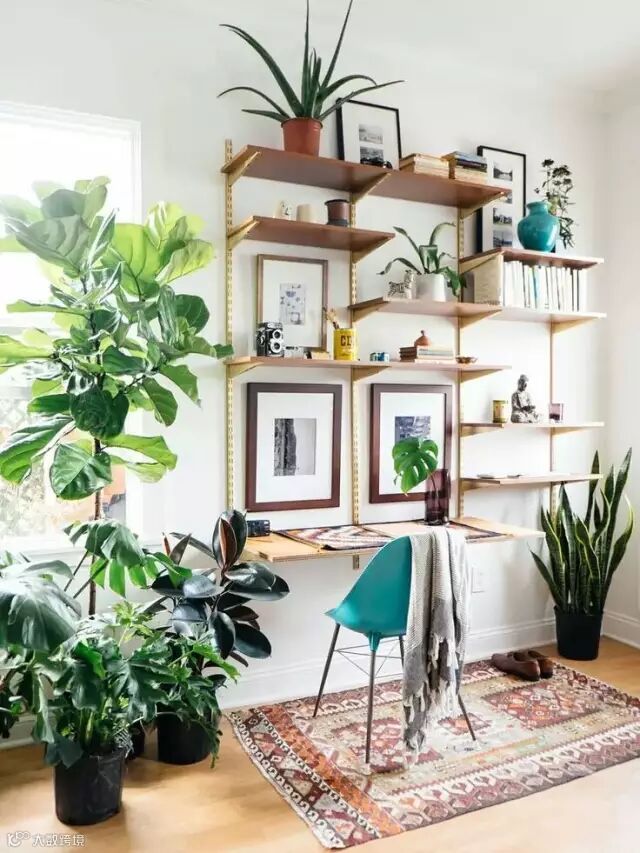 书房内可以摆置一些对人体有益的盆栽,比如山茶花,小桂花,紫藤花,凤眼莲,小叶黄杨等,书看累了可以看看这些生机盎然的小植物