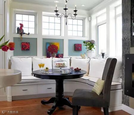 餐厅有飘窗的话,不妨打造一个卡座餐厅,设计精巧、亲近自然,而且还增加了一部分收纳空间,何乐而不为。