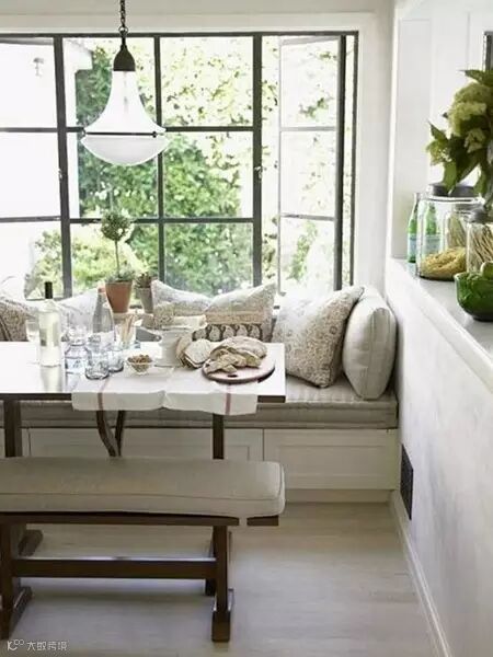 如果有条件的话把家中餐厅打造成一个小包厢也不错,紧挨着窗边,风景独好,简单的卡座设计,一个私密而温暖的交际空间。