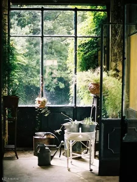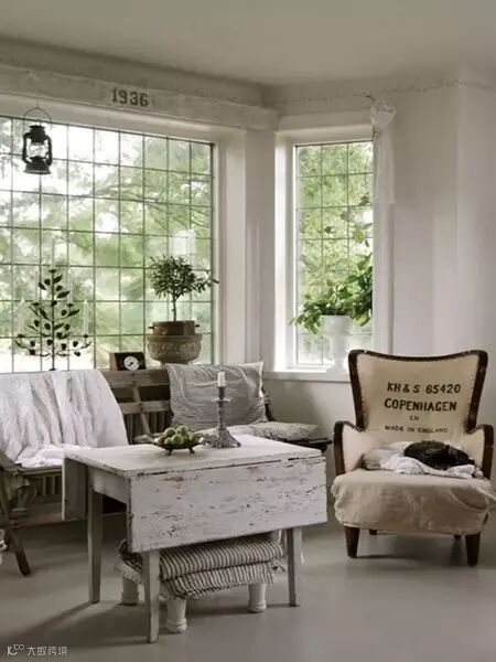 几把椅子靠在窗边,窗台上摆上几株盆栽,朴素的白色搭配原木色,室内外的绿景相互掩映,装点出休闲惬意的乡村生活气氛。