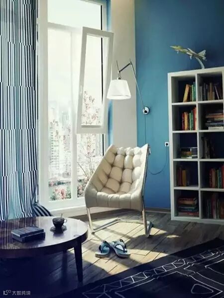 粉刷成蓝色的墙壁让房间显得幽静深邃,落地窗带来充足的采光,一个书架、一把椅子、一张桌子、一盏灯,就能让人在这里赖上一个下午。
