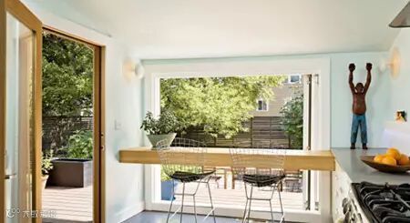 被作为厨房的小屋虽然低矮,却很美,尤其是一侧的墙体是落地窗,而这样的美丽不会被浪费,一块厚实木板的横卧加上两张桌椅,让角落变身早晨角,细数窗外的自然之景。