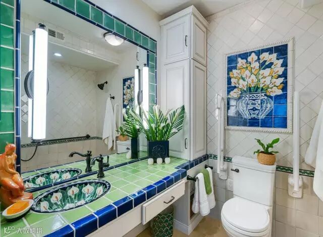▲地中海风格,散发着海洋元素的气息。比如海蓝色的瓷砖,圆形的镜前灯,浮雕墙挂。