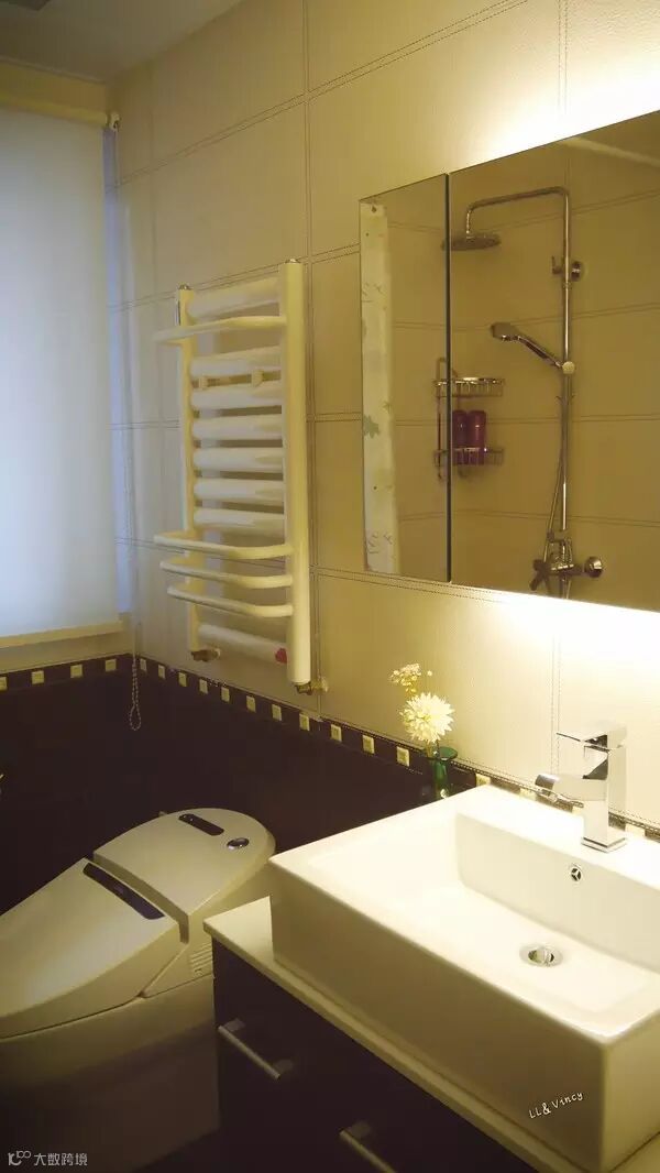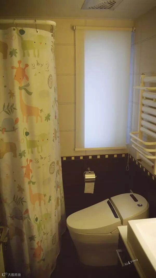 我家卫生间比较小,只能用浴帘来干湿分离啦,墙上挂了垂直区域的收纳架,没有全部都用白色瓷砖,觉得太冷冰冰,也不耐脏。浴帘是小清新的卡通图案。厕所空间小,可以在收纳上下功夫啦。