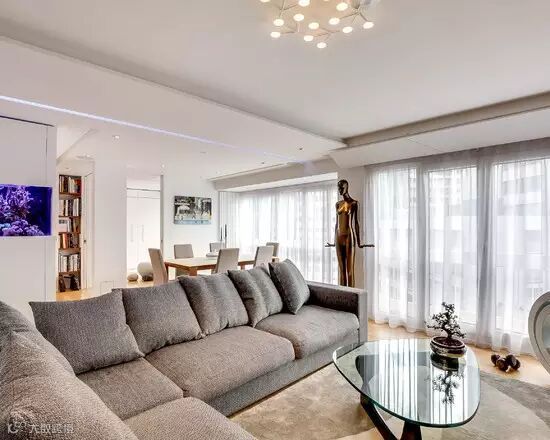 1浅灰色的组合式沙发、相近色调的地毯和玻璃三角茶几组成的客厅区域