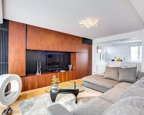 1木质整体电视墙打破空间的沉闷,也将更多的收纳空间隐藏在墙面中