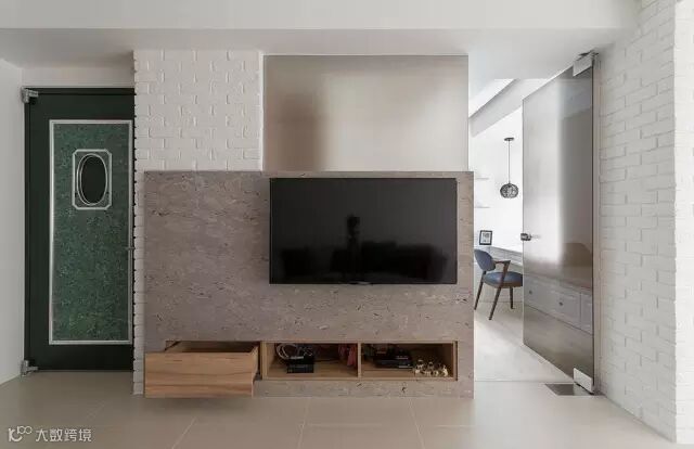 ▲灰色大理石作为电视主墙的材质,并局部搭配文化石与木质元素,材质之间搭配和谐