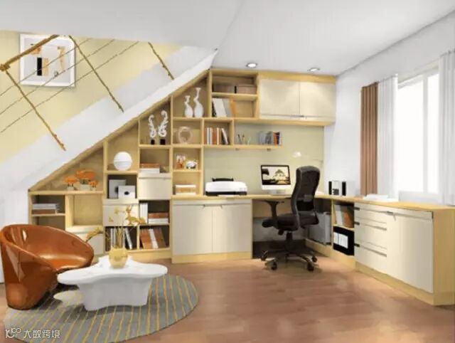 利用楼梯下方的斜顶设计出独特角度和边长的书柜,再奇葩的楼梯角,也能变成高端大气上档次的书房。
