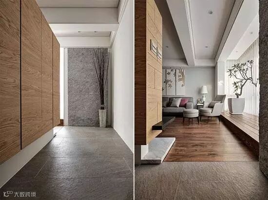 木质电视墙的背面是玄关鞋柜,富有整体性的设计让空间显得整洁大方,隐藏的收纳方案为生活带来了极大的便利。