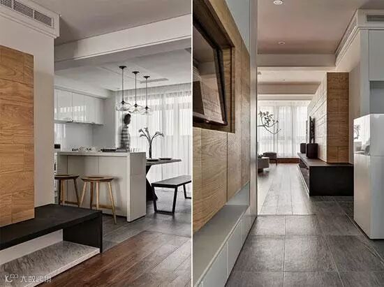客厅与餐厨空间直接连通,木地板与地砖的边界成为空间的划分依据。原木材质的墙面,由客厅延伸到餐厅,营造出空间整体感。