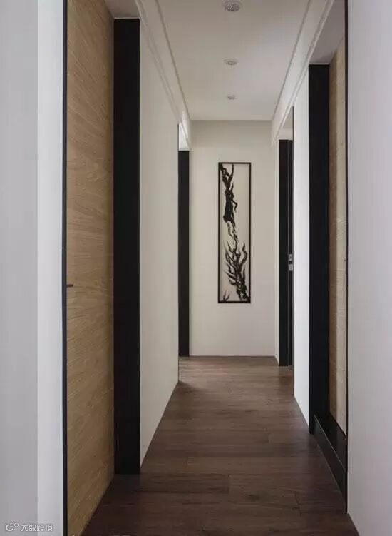 走廊尽头的墙面用一幅挂画来装饰,颇有几分高雅意味。吊顶上的射灯为狭窄的过道提供了照明。