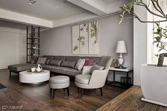 灰色布艺沙发烘托宁静格调,背景墙上一分为三的装饰画衬托自然品味。圆形的白色茶几以圆润的造型为空间增添优雅气质。