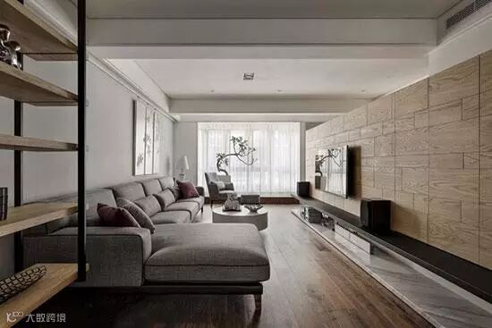 客厅内以清晰的横向线条来营造纵深感,吊顶上的横梁让空间结构更为稳固,在现代简约的风格基础上增加木质元素,营造出安静温和的自然氛围。