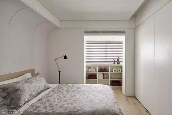 次卧为儿童房,全白色打造显得简单而质朴,延伸出去的小阳台被打造成了收纳间,将空间充分地利用了起来。