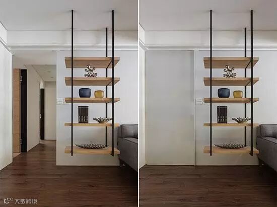 悬吊式收纳架为空间带来灵动气息,层叠之间穿透视觉。一扇门将客厅与其他房间分隔开来,保护了空间的私密性。
