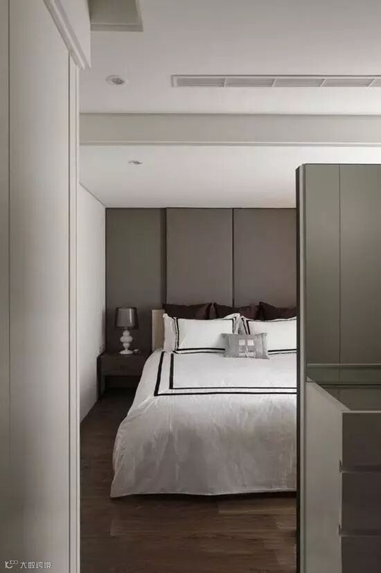 主卧空间以鲜明而立体的色块构成,咖啡色背景墙营造出安静的睡眠环境,搭配白色床品,宁静而优雅。