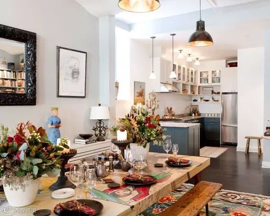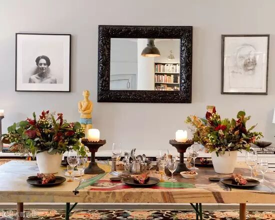 ▲餐厅的墙面用复古墙镜和画框装饰,值得注意的是墙面底部做了一个长的白色边柜,用于摆放物品和收纳