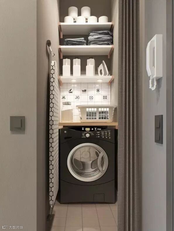 1、把这个窄长的空间设计成了洗衣房,不用的时候,还可以把帘子拉上。