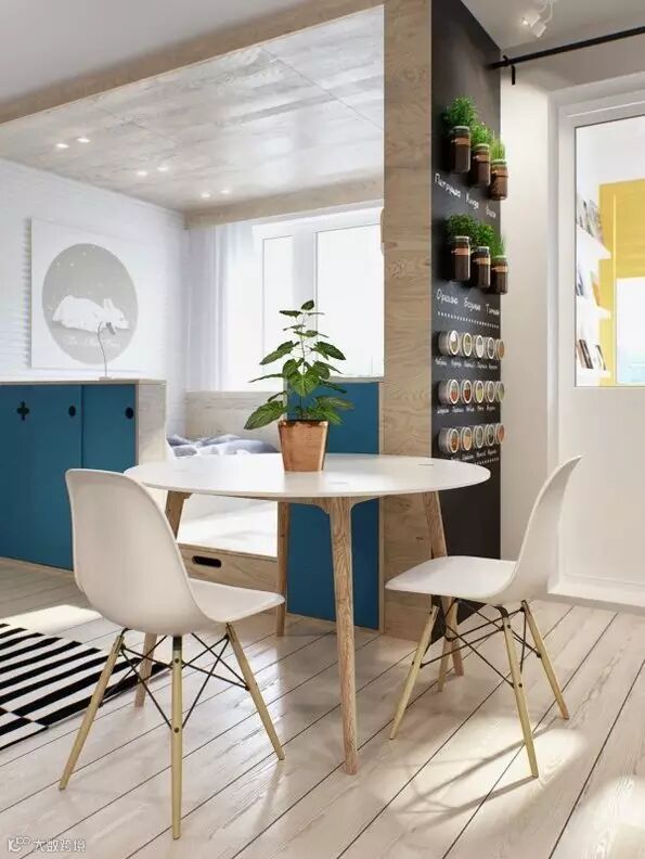 在卧室、客厅、厨房交接的位置有一套白色的简约风格的桌椅,是不同空间的一个过渡。
