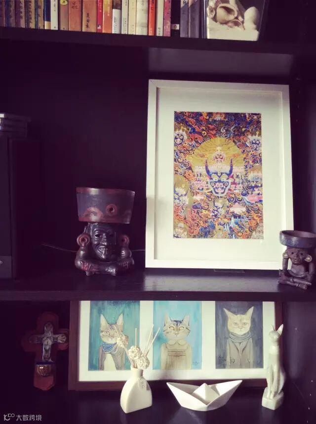 这些是夫妻两旅行过程中搜集的纪念品及手工制品:墨西哥买的黑色陶人,十字架,埃及买的白猫,北京798买的陶瓷纸船,自己临摹的猫插画。