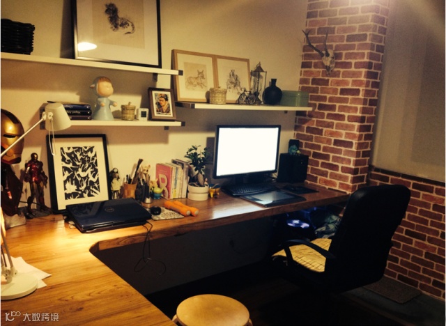 书房只有6平米,如果买写字台就太满了,因此在网上定做了一个L型的老榆木板子,又网购了钢支架钉在墙上支撑,满足了两个人的工作需求。