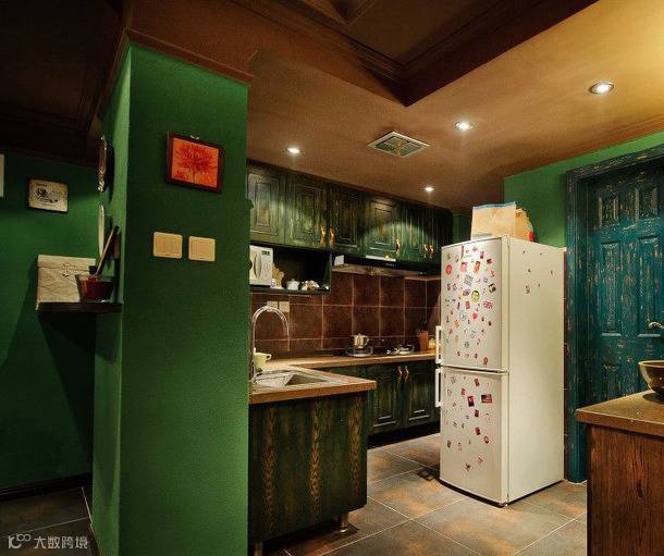 大面采用了绿色的设计,有做旧的处理,每一处都充满了个性与年代感,一个独特张扬的居所。