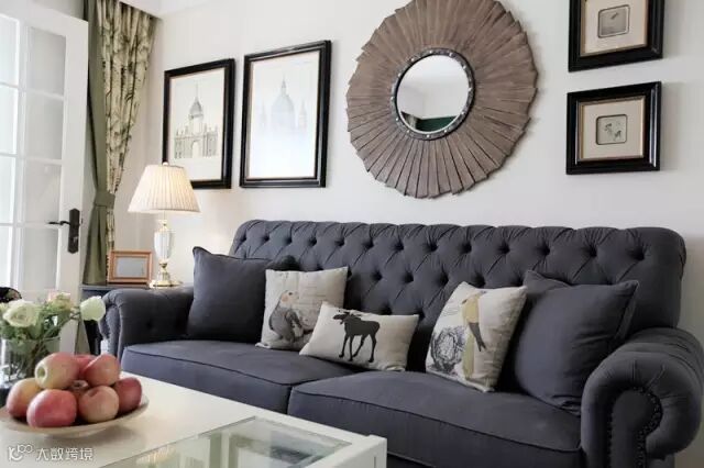 ▶▶▶纯正的实木美式布艺软包沙发+花鸟鹿抱枕,舒适温馨;复古实木太阳镜加上几幅大小不一却又错落有致的装饰画,让整个空间顿时有了调调。