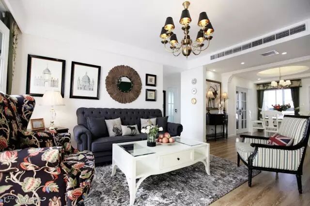 ▶▶▶深色系的美式现代主沙,背部的拉扣设计好看又舒适,加上两款颜色跳跃的单人位,活泼不显单调。用白色的实木茶几提亮了整体;黑色帽子铜质复古吊灯和整体的黑色元素做了呼应。