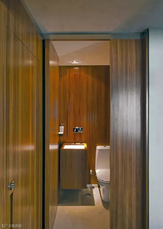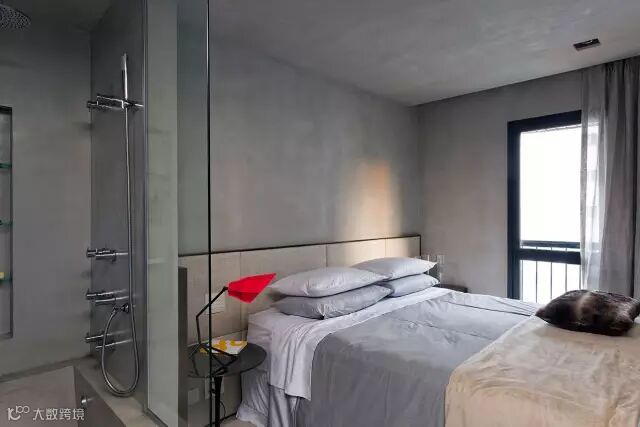 ▲浴室与卧室相邻,案例中是半隔断,是为了让大家看清楚结构。床头的台灯极具线条感,与整体工业风很搭配。