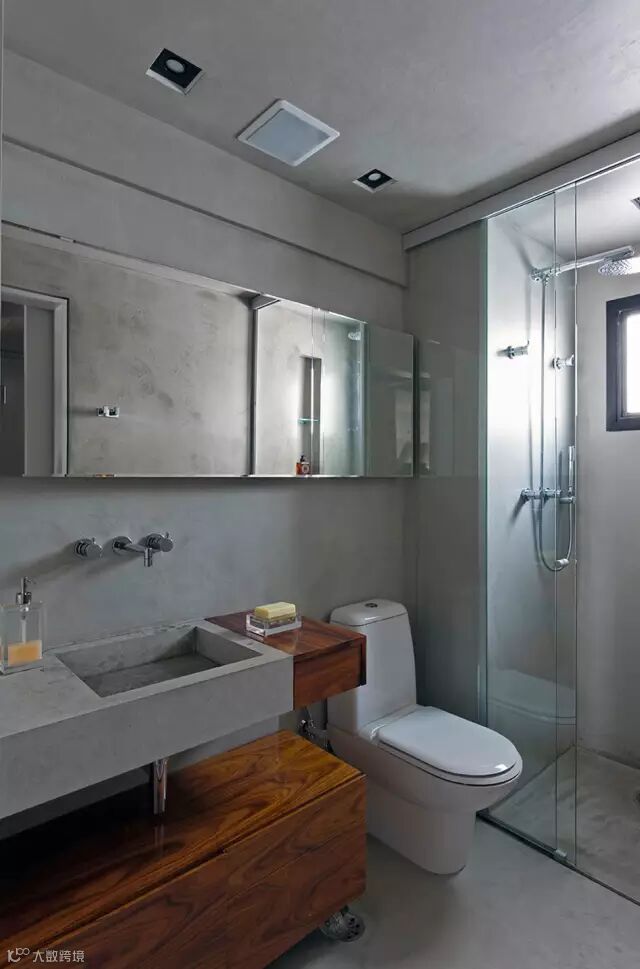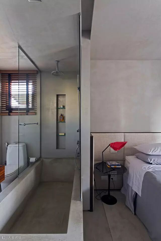▲卧室与卫生间相邻的户型,可以看到墙面都是混凝土色,非常简单与理性。当然墙壁上可以挂一些艺术画来填充,床上用品可以选用暖色调来中和。