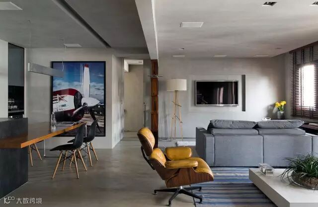 ▲ 餐桌的尽头是一面大白墙,挂了巨幅的海报,显得不那么苍白空荡。也让就餐环境更有情调。电视背景墙采用很简洁的颜色,配合设计感的落地灯,能让视线更聚焦于电视内容上(如果家里电视机使用率比较高,建议电视背景墙尽量简洁一点)