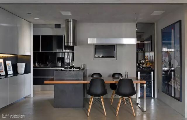 ▲ 黑漆餐凳与木质餐桌是工业风中典型的元素。半开放式的厨房,可以享受与家人一起交流做饭的乐趣。如果担心油烟问题,可以选择做一些适当的隔断,以及挑一款强大的油烟机。