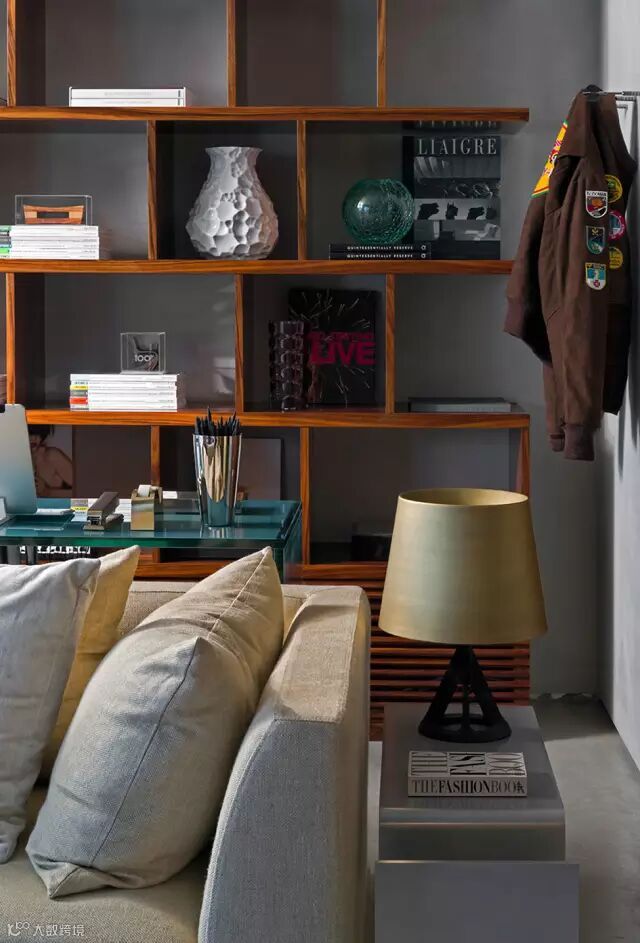 ▲木质储物架让混凝土墙不会显得太冷冰冰,不规则的架子上可以摆放着收藏品,也可以当做酒柜。沙发背后可以放一张简易的工作台,节省了一个书房的空间。