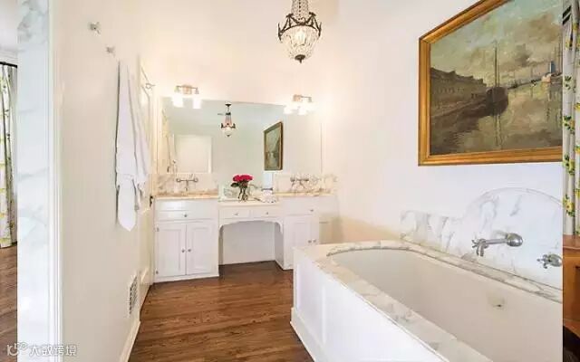 ▲女演员Zooey Deschanel的浴室,大理石、水晶吊灯与古典油画相得益彰。