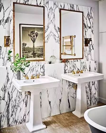 ▲知名室内设计师Nate Berkus用金色点缀大理石墙面,黑+白+金的组合,优雅高贵。