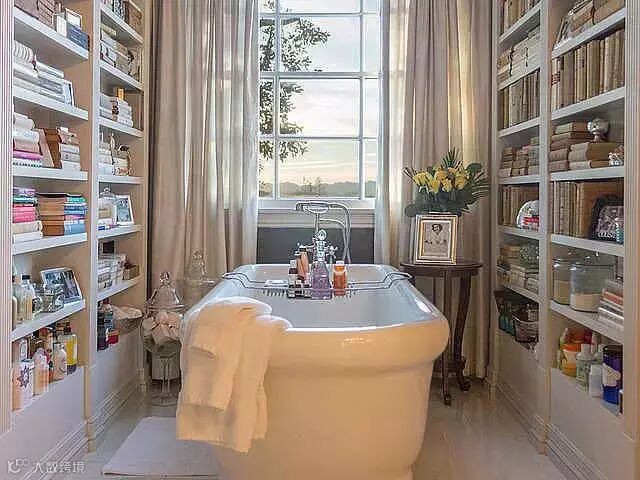 ▲拉丁天后Jennifer Lopez的家,究竟是给浴室设置了阅读角落,还是干脆把浴缸搬进了书房,这些问题已不太重要,总之能够边泡澡边享受书香实在是很棒的体验!