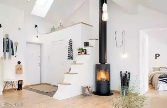 玄关和客厅是同处一个空间的,可以直接的让两者接触,同样也可在空间中设计一个精巧的隔断。上图中的阶梯状隔断在具备了观赏性能的同时还能提供很不错的收纳空间。角落的位置留给了壁炉,黑色的外观是整个空间中的唯一深色系。