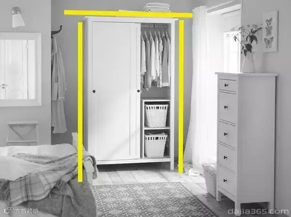 第一张图是宜家的样板间,这个衣柜是我们常常购买的成品衣柜,大约2.1-2.4米高,竖向线条被衣柜线条中断,纵向视觉延伸被阻断(查看我标注的黄色线条)。